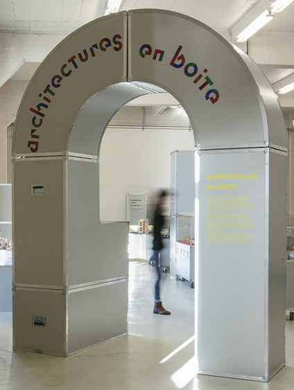 Ce projet est une mise en abîme : l'exposition présente des jeux de construction, la scénographie se construit par un assemblage des modules de présentation en fonction de chaque espace d'exposition, l'identité est créée par des formes simple et une typographie conçue en écho aux modules scénographiques.