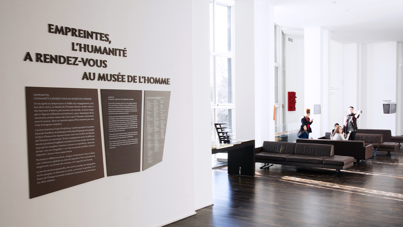 au-delà de la commande proposition originale d'un dialogue graphique : tel un fil d'Ariane, la parole des peuples et des personnalités invités se répand dans les espaces du musée pour guider et interpeller le visiteur tout au long du parcours
